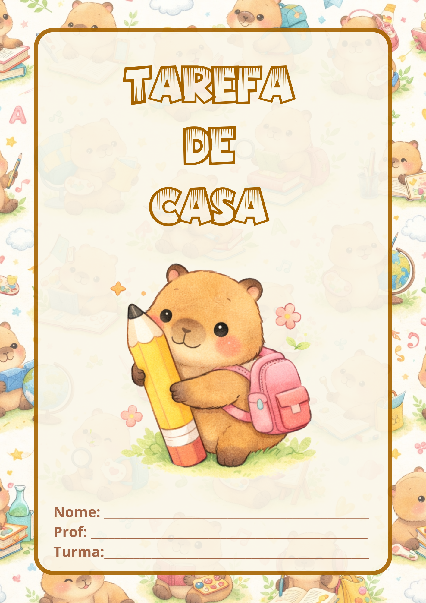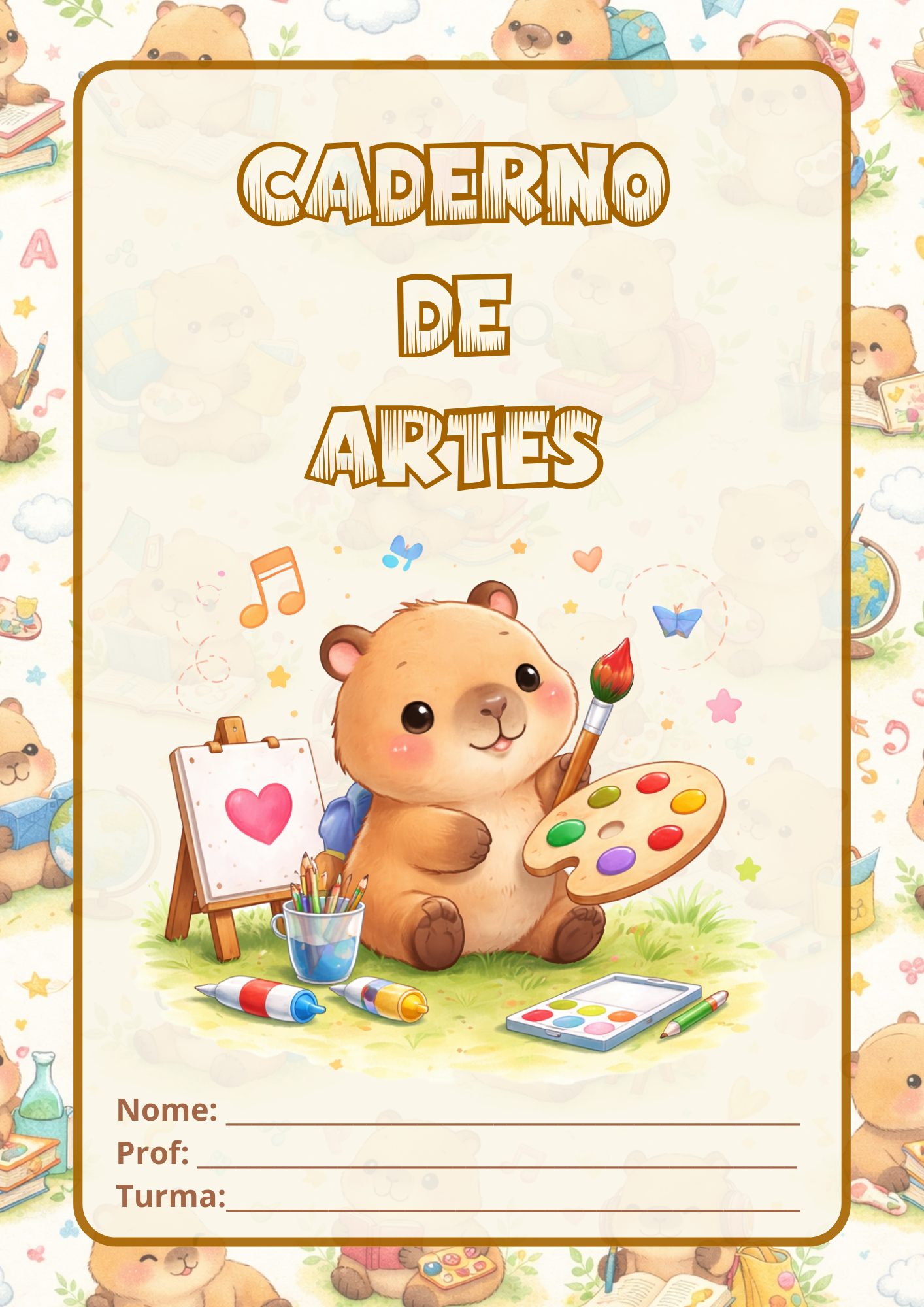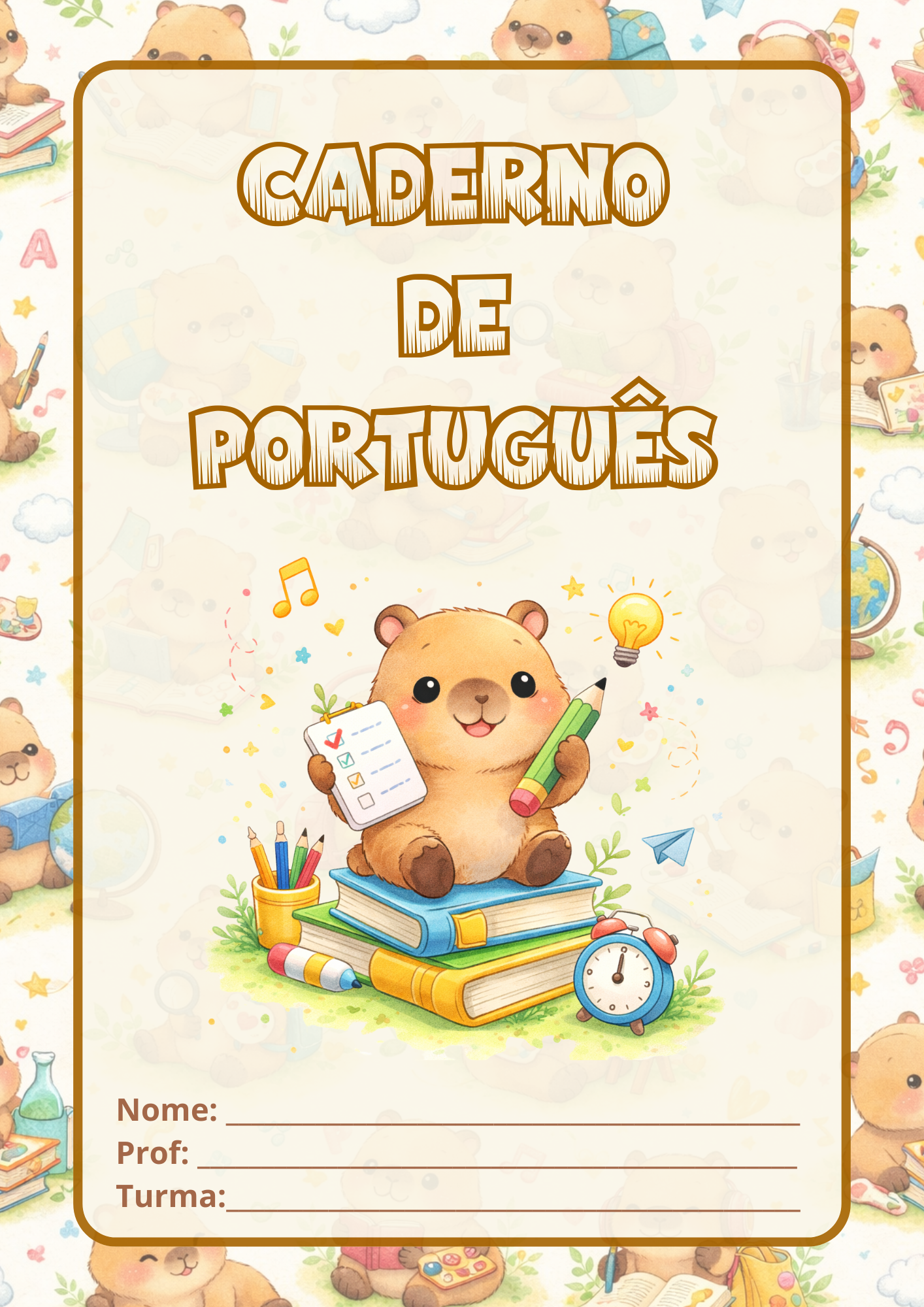 Professora, preparei um arquivo digital com capas de cadernos escolares super fofinhas, ilustradas com capivara em estilo cute/kawaii, ideais para Educação Infantil e Ensino Fundamental 🥰