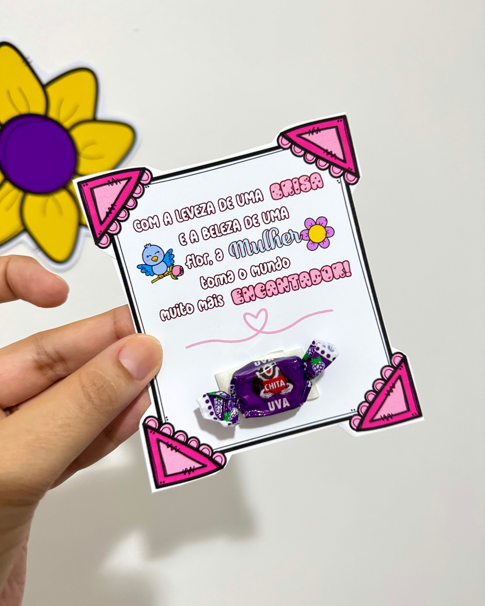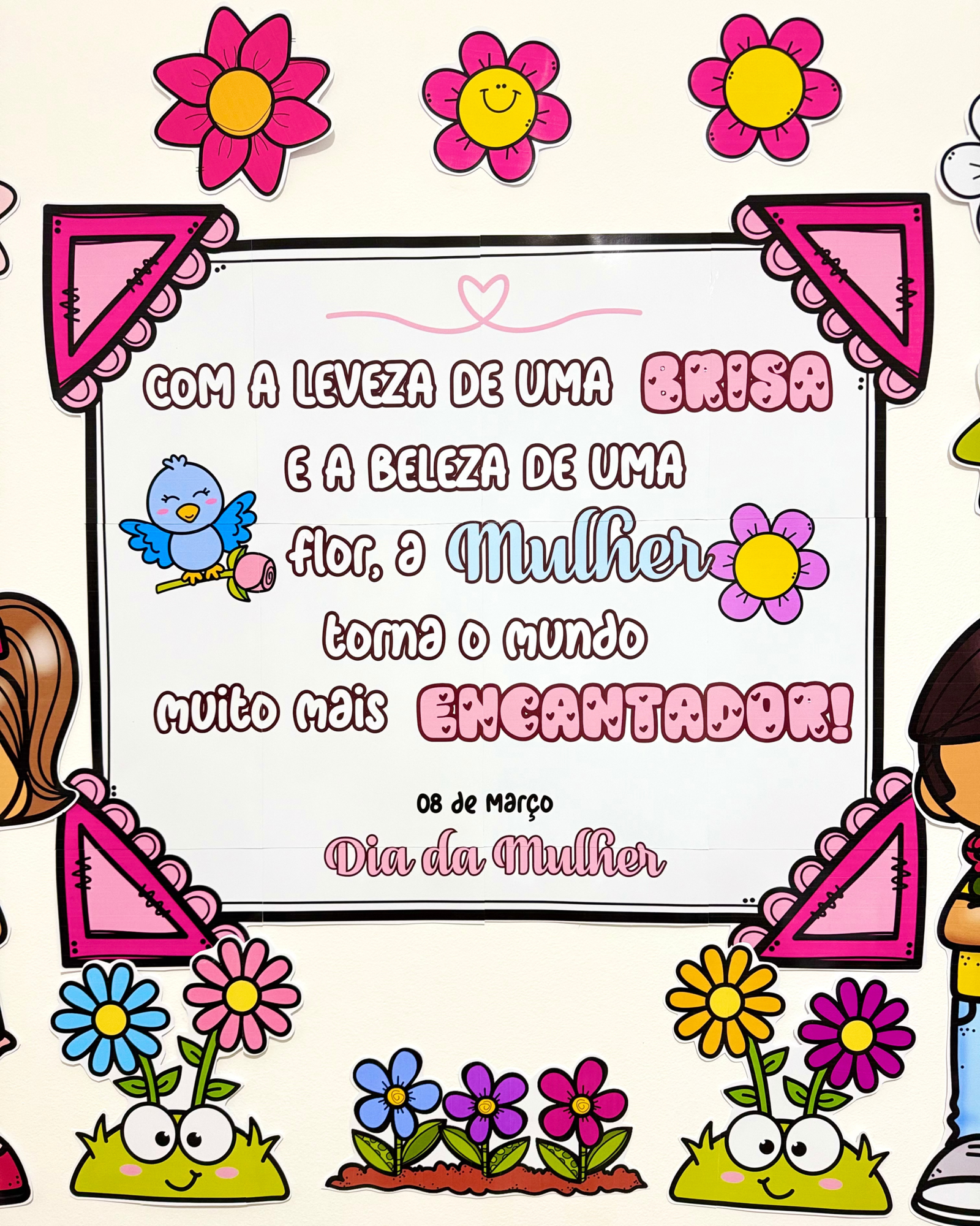 O material traz um painel decorativo com mensagem temática e lembrancinhas coordenadas, ideais para trabalhar a data em sala de aula, valorizar as mulheres da comunidade escolar e tornar o momento ainda mais especial.